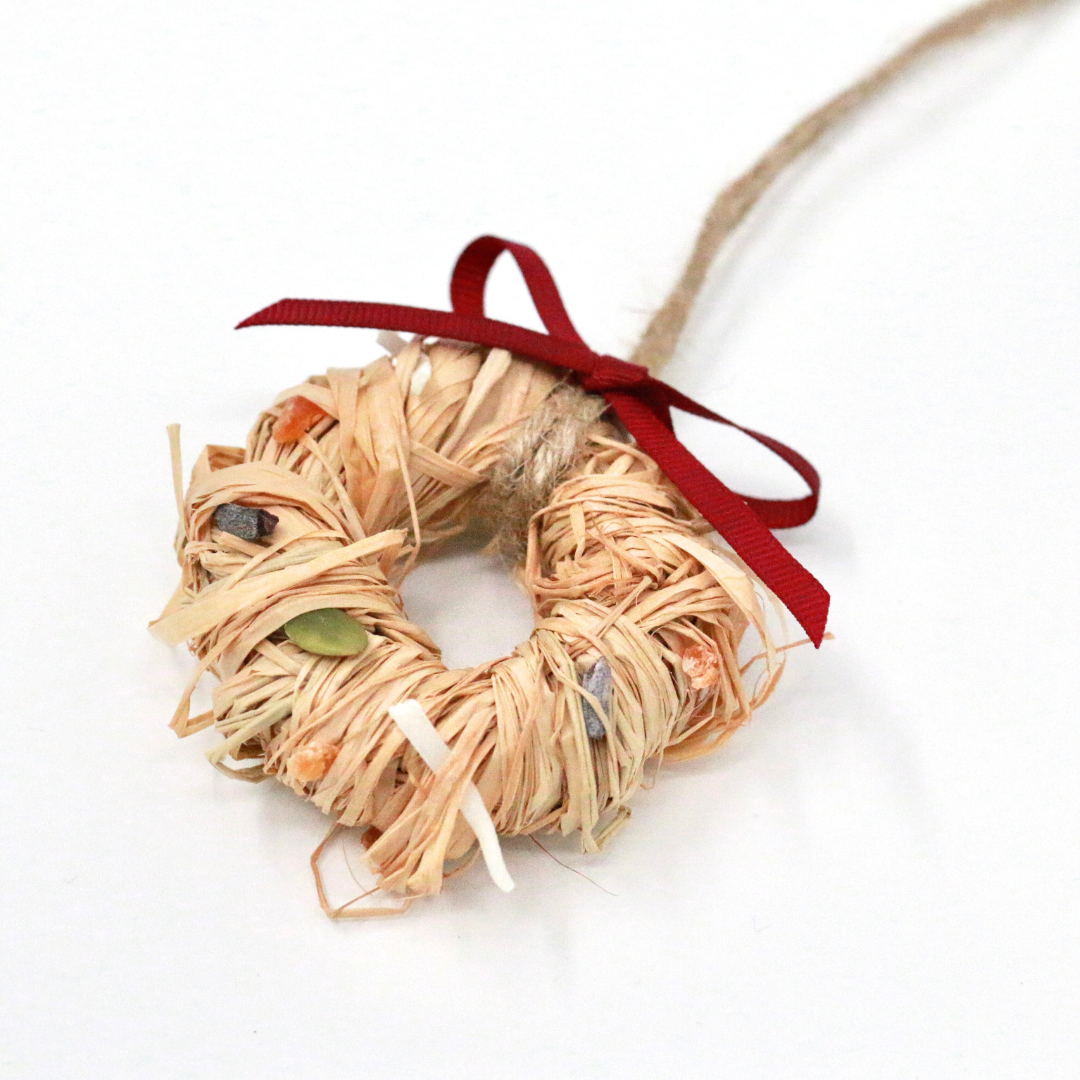 リースの土台には、小動物がかじっても安心な天然素材(ラフィア)を使用。
